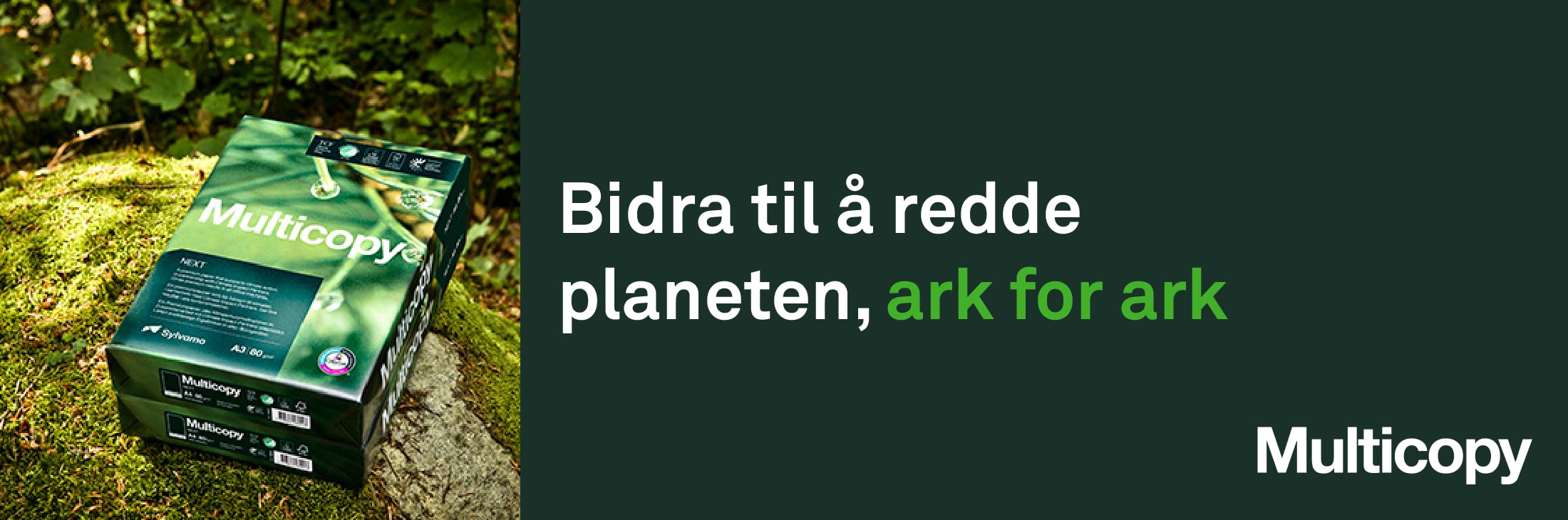 Multicopy Next er et førsteklasses, karbonnøytralt papir, til bruk i alle kontormaskiner. Ved å velge det, bidrar du til å oppfylle egne miljømål, og er også et lite skritt på veien til å redusere den globale oppvarmingen – ark for ark. Du behøver ikke inngå noe kompromiss, og du kan fremdeles se bra ut samtidig som du gjør noe bra. Multicopy Next gir deg glimrende utskrifter både i farger og sort/hvitt, utmerket kjørbarhet og en følelse av å ha gjort noe bra. Er tilgjengelig i A4 and A3-formatene i 80 gram.